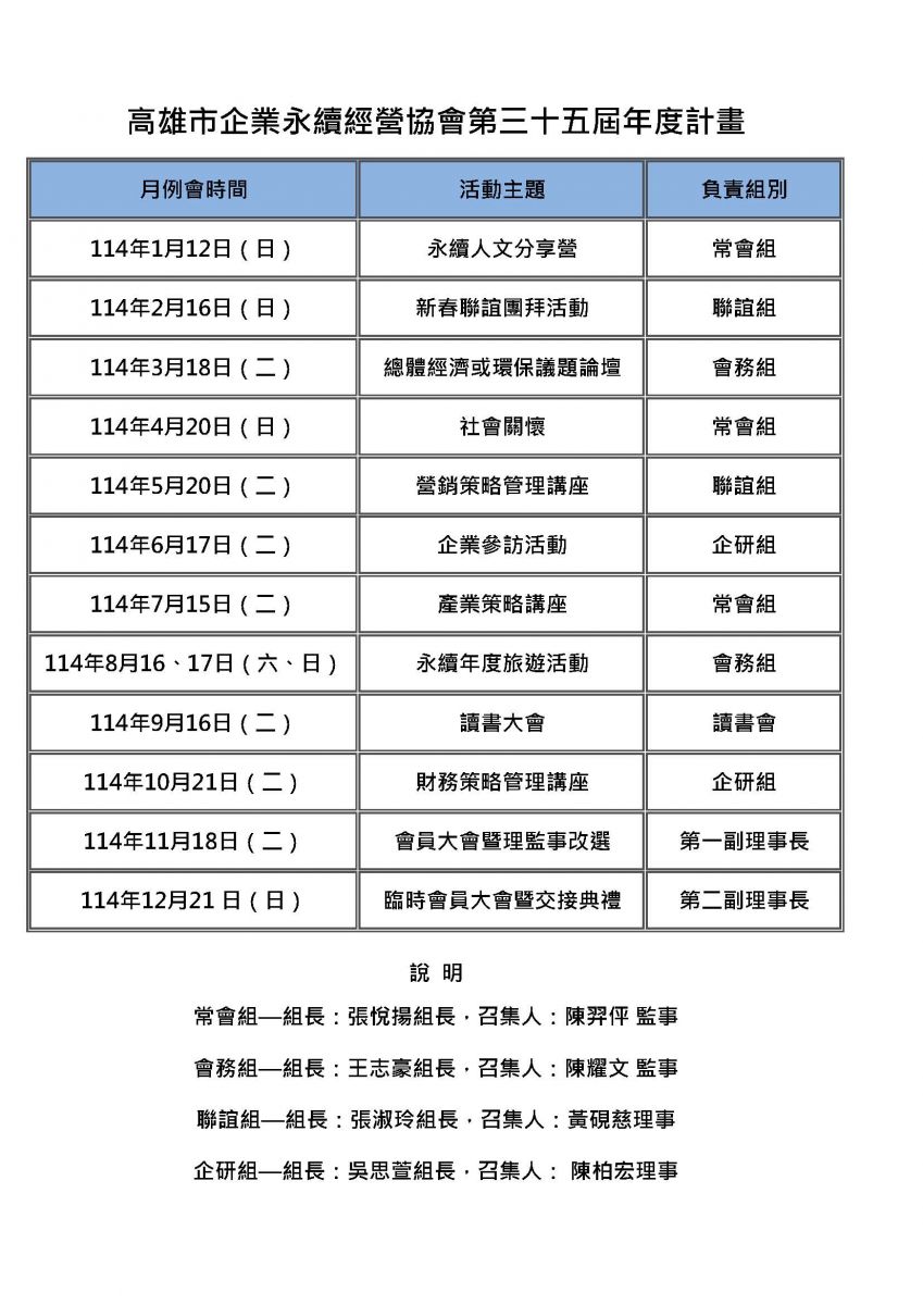114年第35屆月例會講座及各機能小組工作項目分配表
