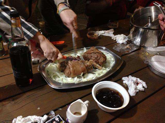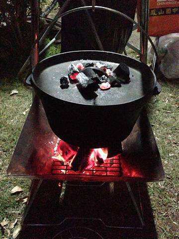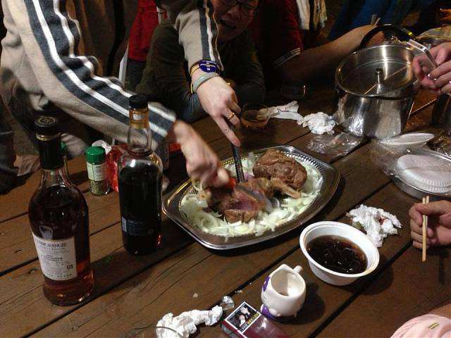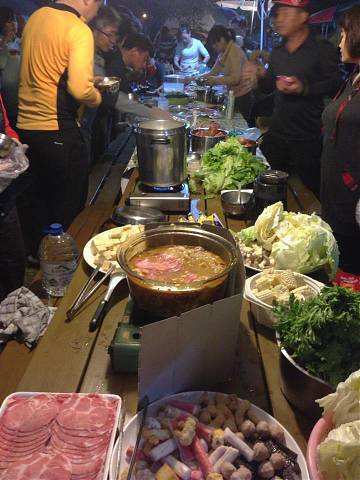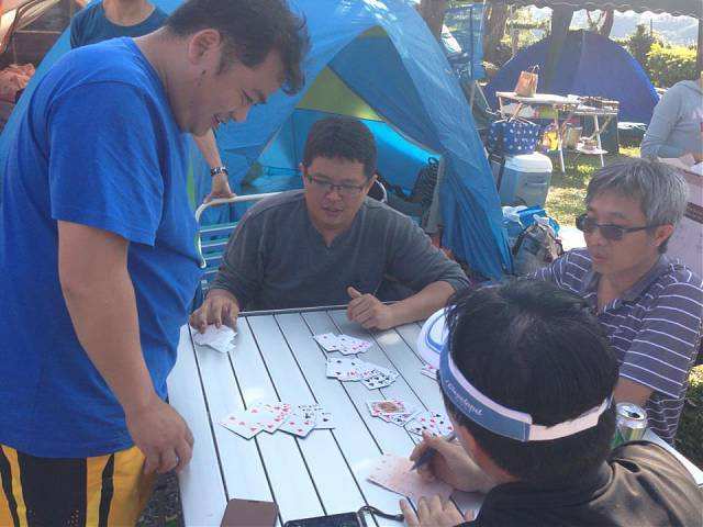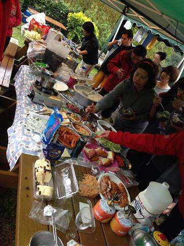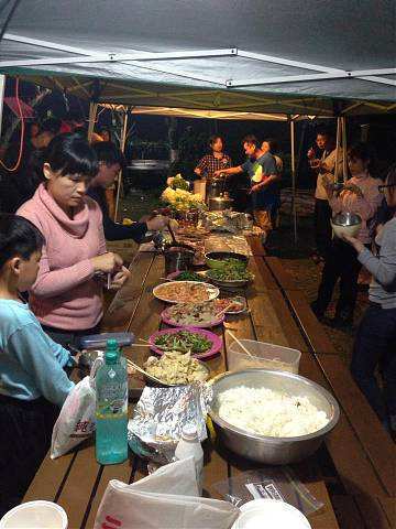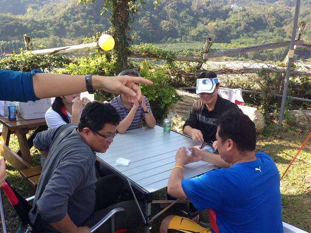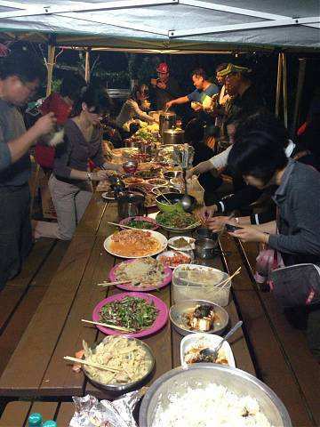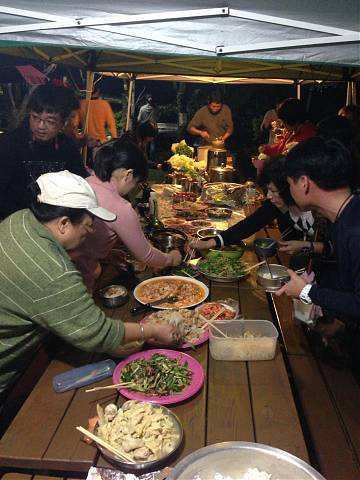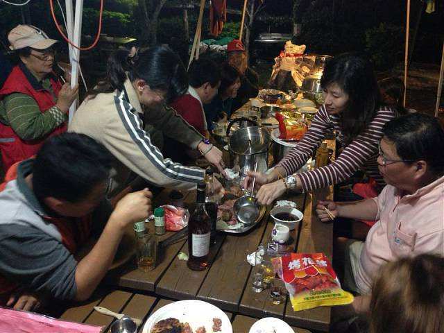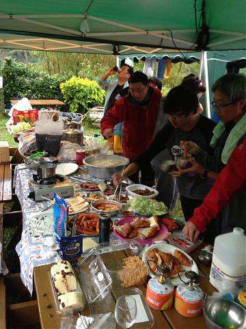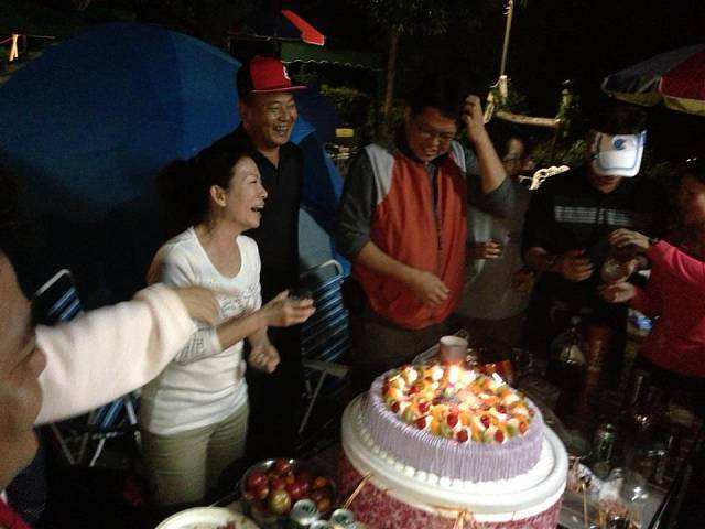 約莫一個多小時過去,大夥回到寶來街上去找尋享用傳說中的檸檬愛玉冰,好客慷慨的興哥還付錢請客在座的會友(因為我也是受惠者,故在此銘謝之),之後回到蘇羅婆營地,準備展開第一晚的重頭戲,就是每戶端出自己拿手菜餚與所有參加的會友及眷屬們共享同歡。寫到這裡,不得不一一陳述各戶名菜,因為有你(妳)的參與投入,這個團體才益顯彼此熟絡,不像我個人曾參加過其他露營團體活動,各煮各吃各的,一點Fu都沒有!好,準備流口水吧!菜色有安東尼家的鹹豬肉炒蒜苗+荷蘭豬腳(秒殺王)+米粉炒+客家小炒、安東尼朋友的蒜頭蝦、阿嘉家的烤肉總匯、志豪的中華豆腐料理(人氣王)、健清家的鹽酥鯖魚+炸銀絲捲+蘿蔔排骨湯+培根花椰菜(小秘大廚)、阿富家的香辣豬皮捲+涼拌洋蔥、淑玲家的紅豆薏仁甜湯+紅茶+麻辣鍋+香腸、明政的滷肉飯、Julia與幸美的東山鴨翅滷味+大片黑輪、明宏家提供的水果+飲料、明宏友的麻油龍鬚菜+絲瓜炒蛤蜊、淑霞姐的愛心菜粽(愛心由來是姐姐的無料提供)、碧玲的毛豆與滷味豆干、米卡老闆娘的番茄炒蛋+炒高麗菜(人氣王),最後要帶上一筆的是一日快閃的阿毅自高雄帶來的18吋大蛋糕替當天的壽星-幸美-慶生,結果大家在享用如此的豐盛菜餚後,其後為壽星幸美慶生,如此的大蛋糕當然是消化不了,也因此如同電影場景般的搗蛋情節,由志豪發動的白面書生大戰白髮魔女的戲碼于焉開始。