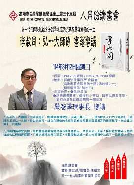 八月份的讀書會活動,我們邀請到嚴智譯理事長擔任導讀人,帶領大家一起深入探討這位傳奇人物的功成名就與轉折選擇,了解李叔同如何在豐富、複雜卻和諧統一的人格特質中完成了一段傳奇人生。